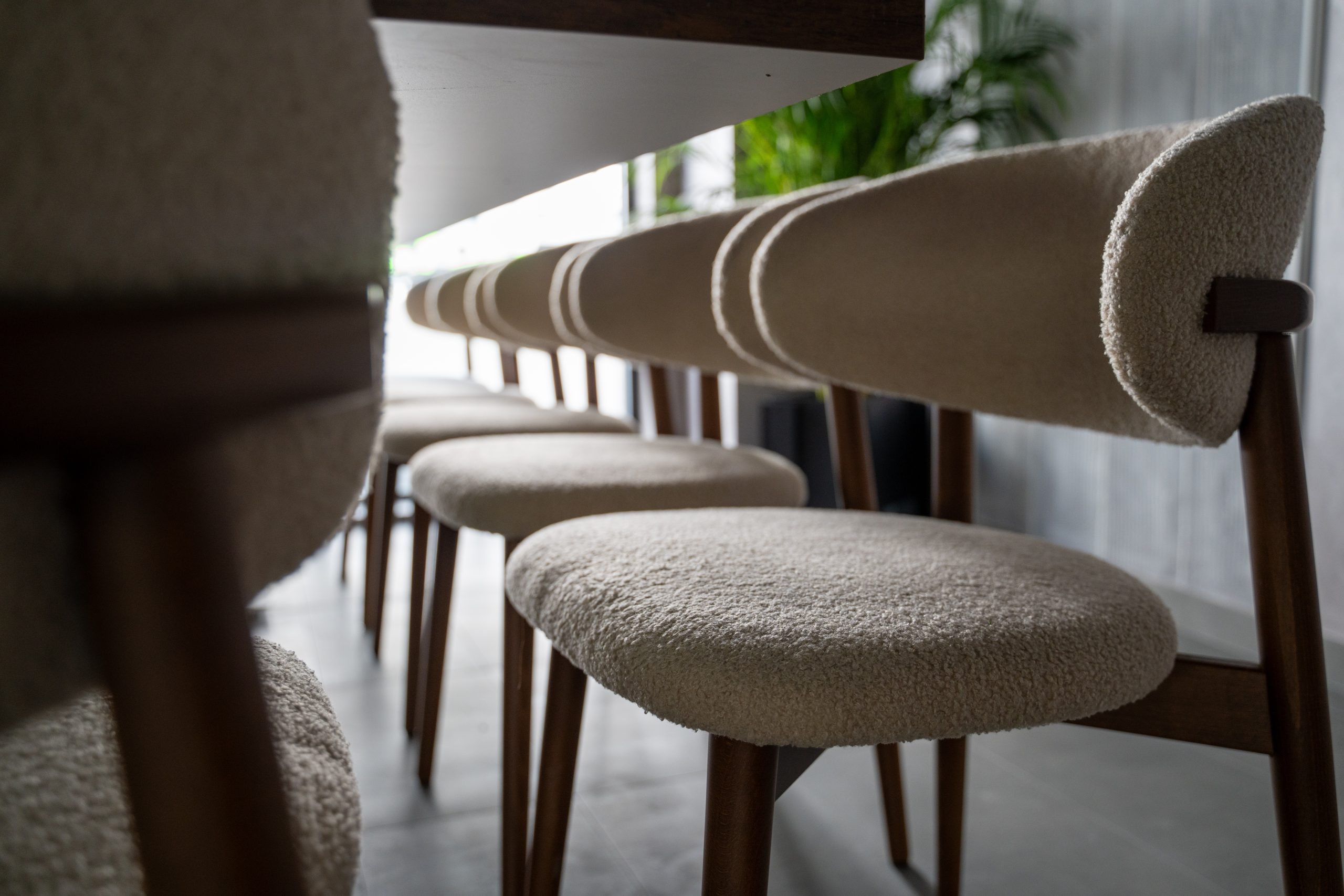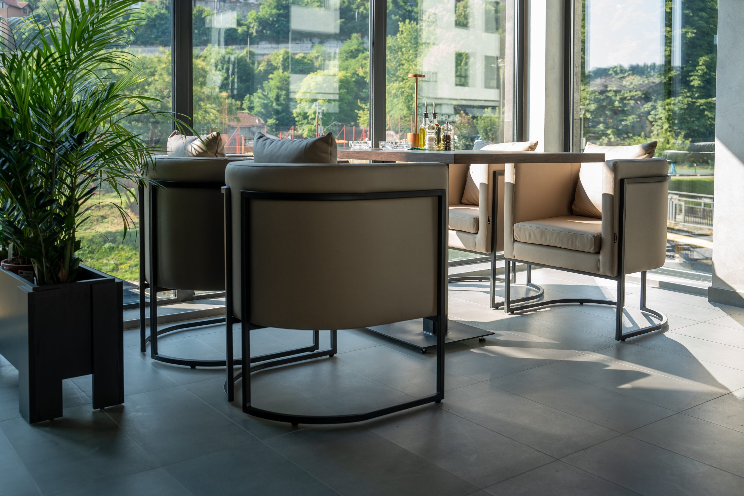 Opremljen je moderan restoran sa pažljivo odabranim stolicama i foteljama. Korišćeno je više različitih modela kako bi se obezbedila raznovrsnost i vizuelna dinamika.